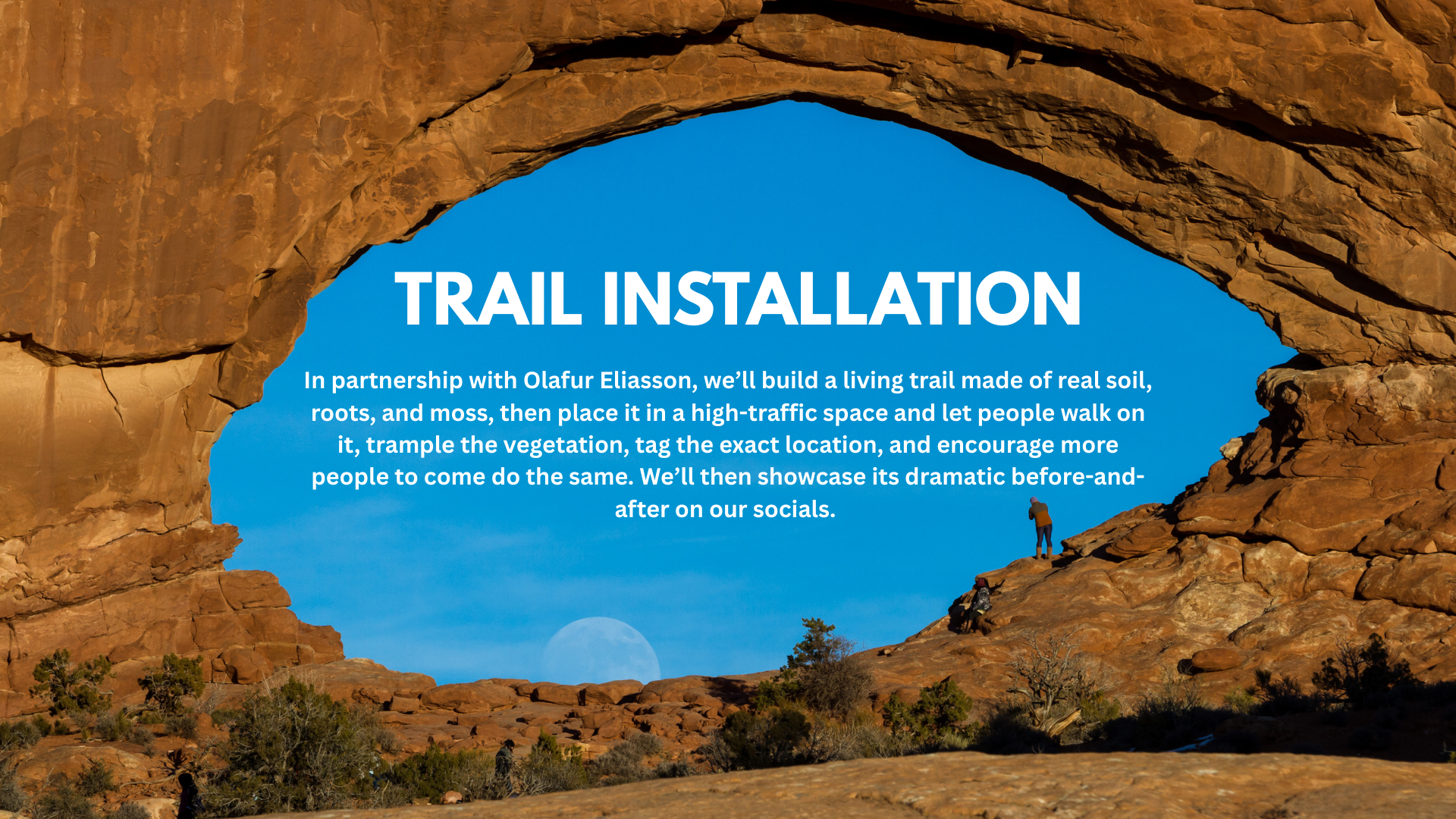 Additionally, to make the problem impossible to ignore, we’ll partner with large-scale installation artist Olafur Eliasson to build a living trail made of real soil, roots, and moss—then place it in a high-traffic space and let audiences walk on it, trample the vegetation, tag the exact location and encourage more people to come, and witness its dramatic before-and-after.